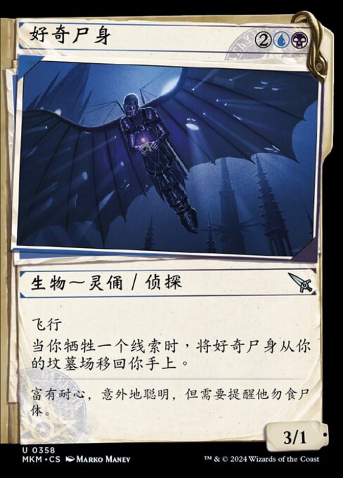 | Rules | Flying When you sacrifice a Clue, return Curious Cadaver from your graveyard to your hand. |
