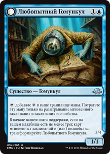 | Rules | : Add . Spend this mana only to cast an instant or sorcery spell. At the beginning of your upkeep, if there are three or more instant and/or sorcery cards in your graveyard, transform Curious Homunculus. // Prowess (Whenever you cast a noncreature spell, this creature gets +1/+1 until end of turn.) Instant and sorcery spells you cast cost less to cast. |