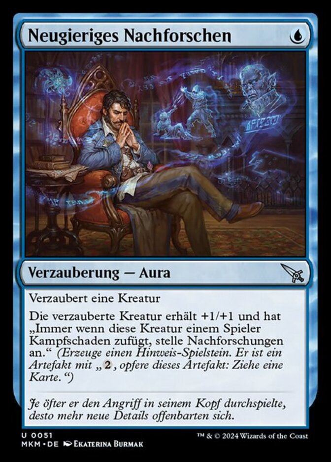 | Rules | Enchant creature Enchanted creature gets +1/+1 and has "Whenever this creature deals combat damage to a player, investigate." (Create a Clue token. It's an artifact with ", Sacrifice this artifact: Draw a card.") |
