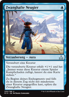 | Rules | Enchant creature Enchanted creature gets +1/+1 and has "Whenever this creature deals combat damage to a player, you may draw a card." At the beginning of your end step, if you didn't attack with a creature this turn, sacrifice Curious Obsession. |