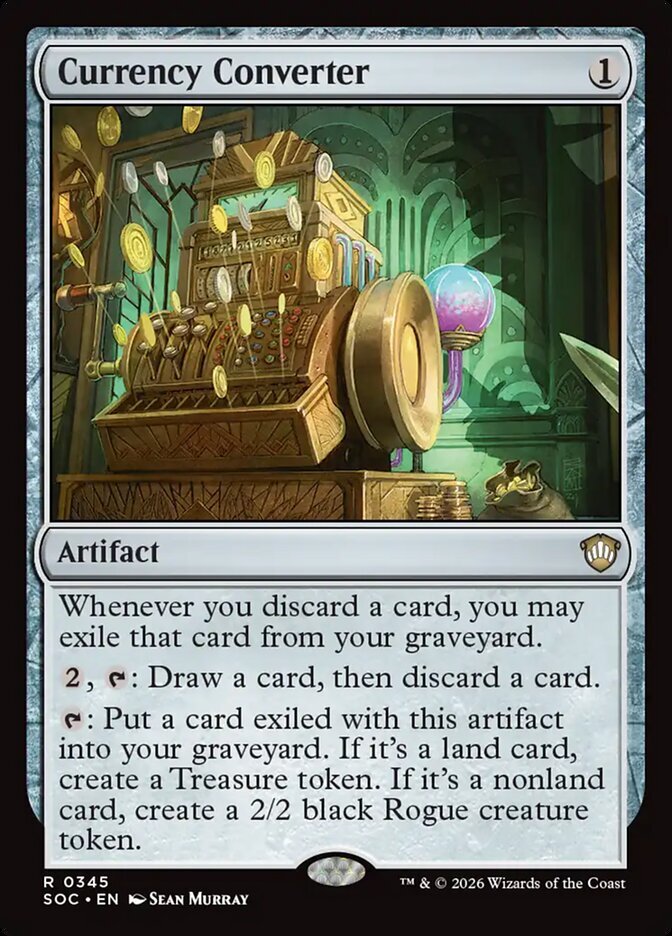 | Rules | Whenever you discard a card, you may exile that card from your graveyard. , : Draw a card, then discard a card. : Put a card exiled with Currency Converter into your graveyard. If it's a land card, create a Treasure token. If it's a nonland card, create a 2/2 black Rogue creature token. |
