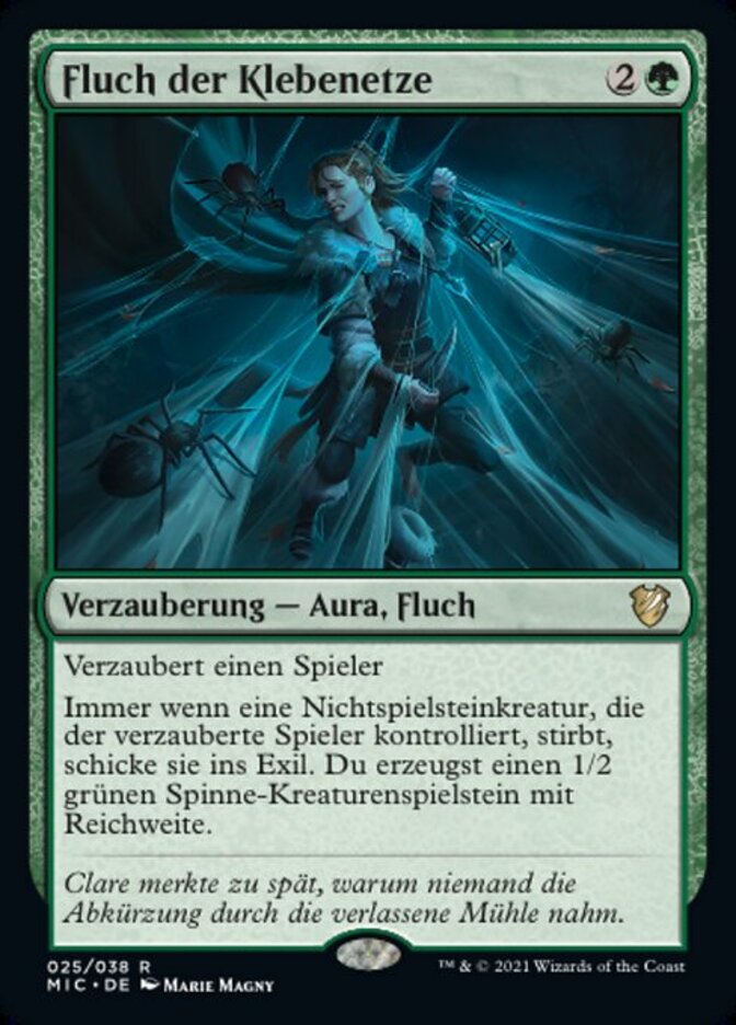 | Rules | Enchant player Whenever a nontoken creature enchanted player controls dies, exile it and you create a 1/2 green Spider creature token with reach. |