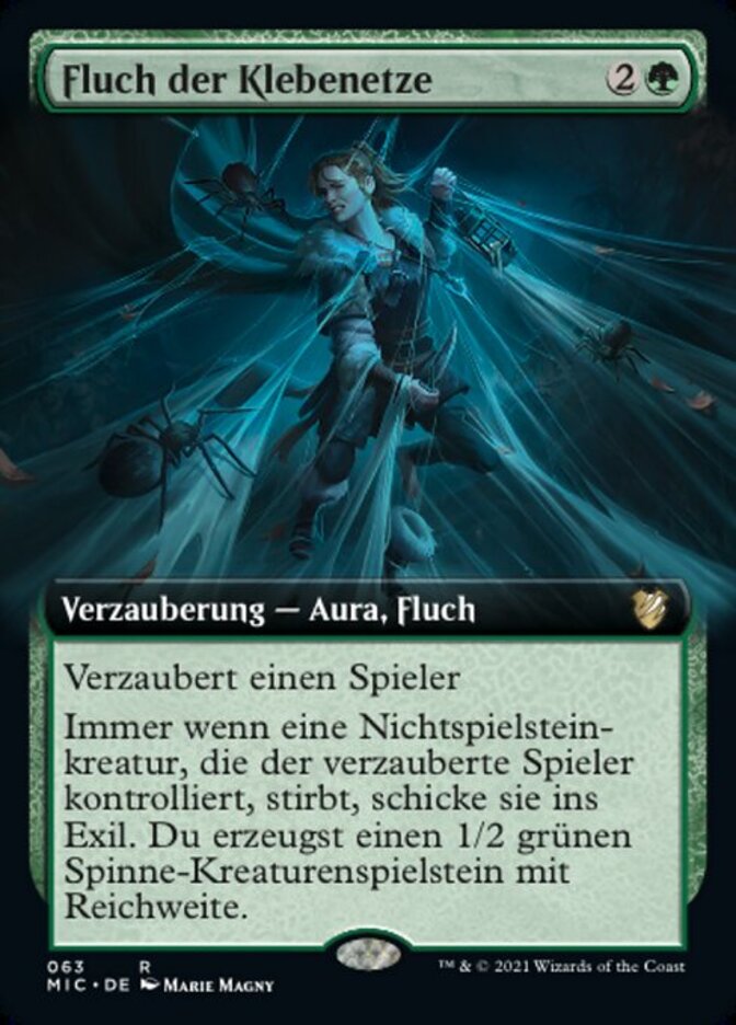 | Rules | Enchant player Whenever a nontoken creature enchanted player controls dies, exile it and you create a 1/2 green Spider creature token with reach. |