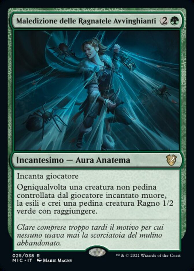 | Rules | Enchant player Whenever a nontoken creature enchanted player controls dies, exile it and you create a 1/2 green Spider creature token with reach. |