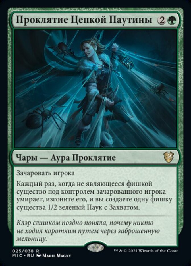 | Rules | Enchant player Whenever a nontoken creature enchanted player controls dies, exile it and you create a 1/2 green Spider creature token with reach. |