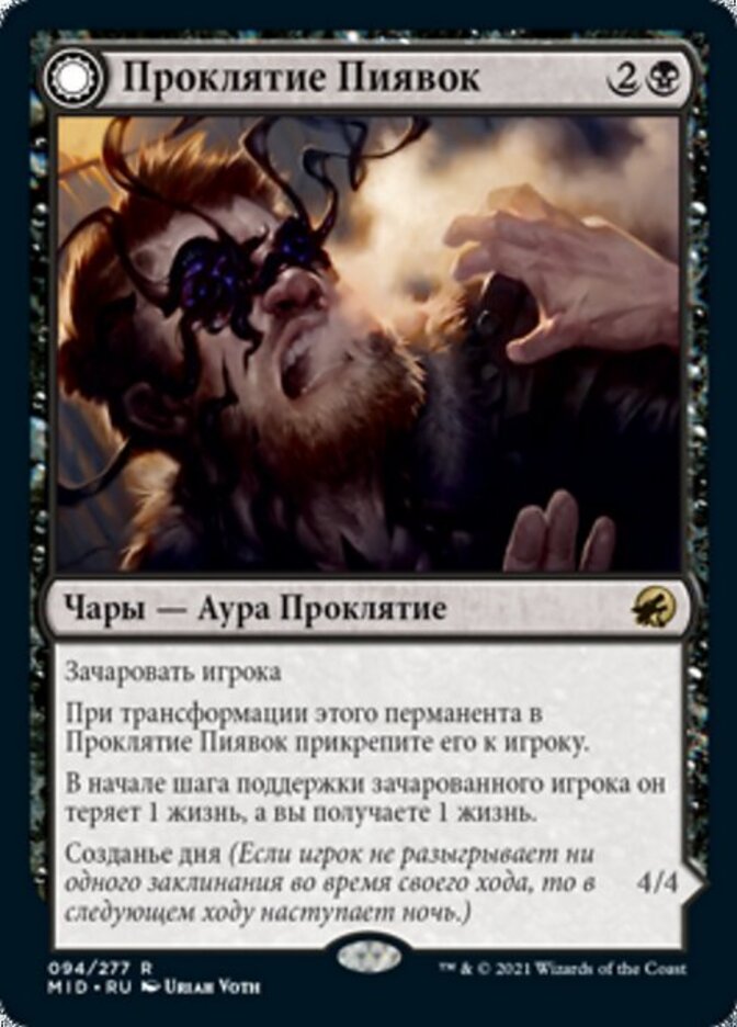 | Rules | Enchant player As this permanent transforms into Curse of Leeches, attach it to a player. At the beginning of enchanted player's upkeep, they lose 1 life and you gain 1 life. Daybound (If a player casts no spells during their own turn, it becomes night next turn.) // Lifelink Nightbound (If a player casts at least two spells during their own turn, it becomes day next turn.) |
