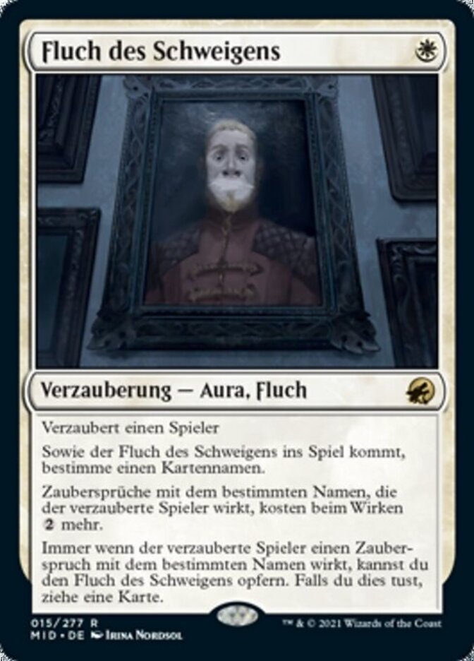 | Rules | Enchant player As Curse of Silence enters the battlefield, choose a card name. Spells with the chosen name enchanted player casts cost more to cast. Whenever enchanted player casts a spell with the chosen name, you may sacrifice Curse of Silence. If you do, draw a card. |