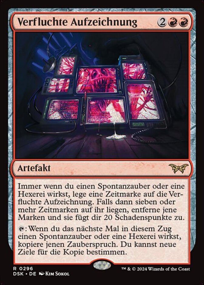 | Rules | Whenever you cast an instant or sorcery spell, put a time counter on Cursed Recording. Then if there are seven or more time counters on it, remove those counters and it deals 20 damage to you. : When you next cast an instant or sorcery spell this turn, copy that spell. You may choose new targets for the copy. |