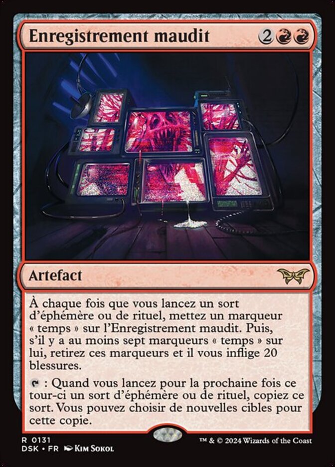 | Rules | Whenever you cast an instant or sorcery spell, put a time counter on Cursed Recording. Then if there are seven or more time counters on it, remove those counters and it deals 20 damage to you. : When you next cast an instant or sorcery spell this turn, copy that spell. You may choose new targets for the copy. |