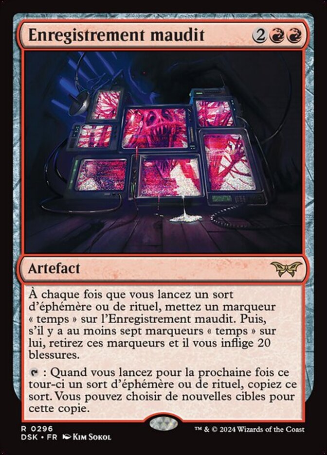 | Rules | Whenever you cast an instant or sorcery spell, put a time counter on Cursed Recording. Then if there are seven or more time counters on it, remove those counters and it deals 20 damage to you. : When you next cast an instant or sorcery spell this turn, copy that spell. You may choose new targets for the copy. |