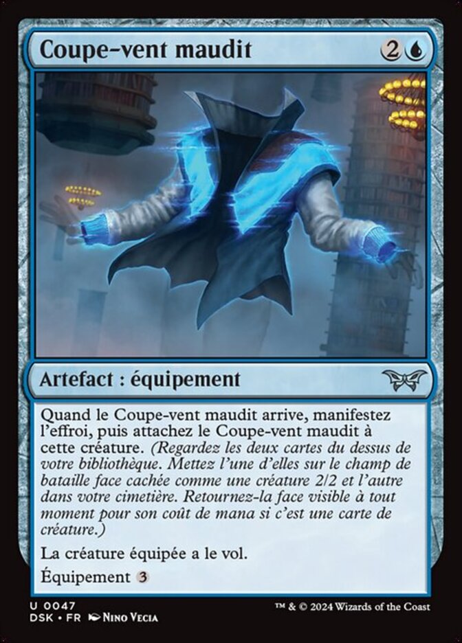 | Rules | When Cursed Windbreaker enters, manifest dread, then attach Cursed Windbreaker to that creature. (Look at the top two cards of your library. Put one onto the battlefield face down as a 2/2 creature and the other into your graveyard. Turn it face up any time for its mana cost if it's a creature card.) Equipped creature has flying. Equip |