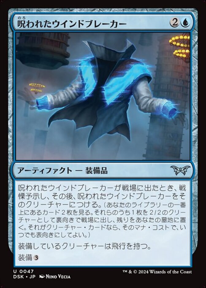 | Rules | When Cursed Windbreaker enters, manifest dread, then attach Cursed Windbreaker to that creature. (Look at the top two cards of your library. Put one onto the battlefield face down as a 2/2 creature and the other into your graveyard. Turn it face up any time for its mana cost if it's a creature card.) Equipped creature has flying. Equip |