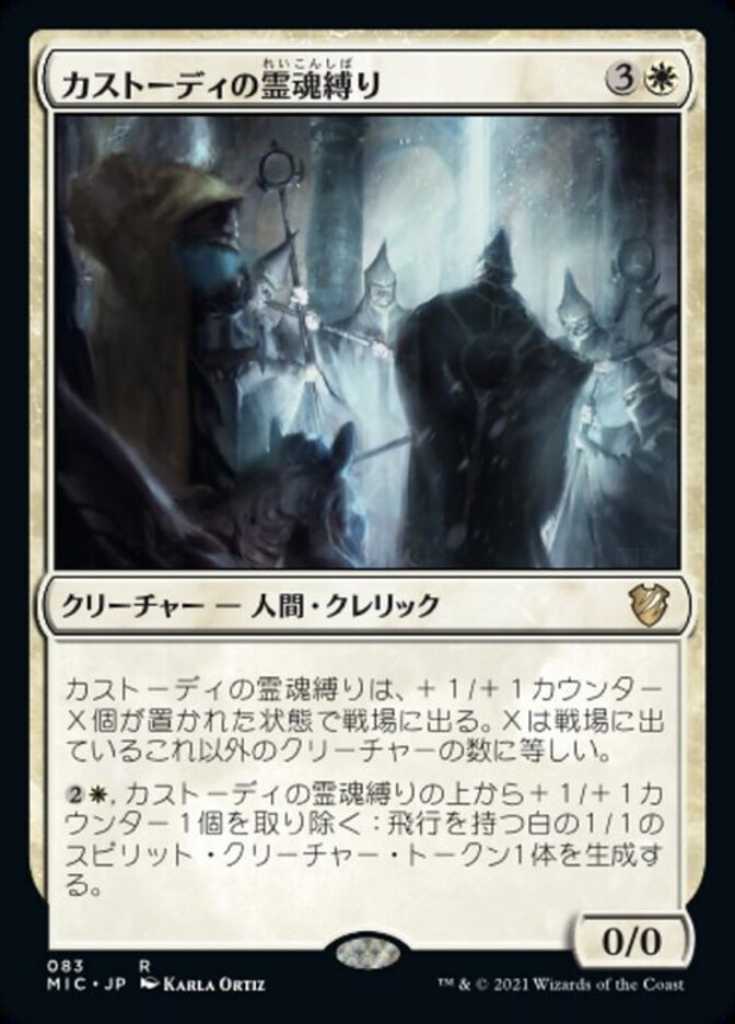 | Rules | Custodi Soulbinders enters the battlefield with X +1/+1 counters on it, where X is the number of other creatures on the battlefield. , Remove a +1/+1 counter from Custodi Soulbinders: Create a 1/1 white Spirit creature token with flying. |