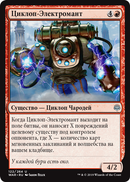 | Rules | When Cyclops Electromancer enters the battlefield, it deals X damage to target creature an opponent controls, where X is the number of instant and sorcery cards in your graveyard. |