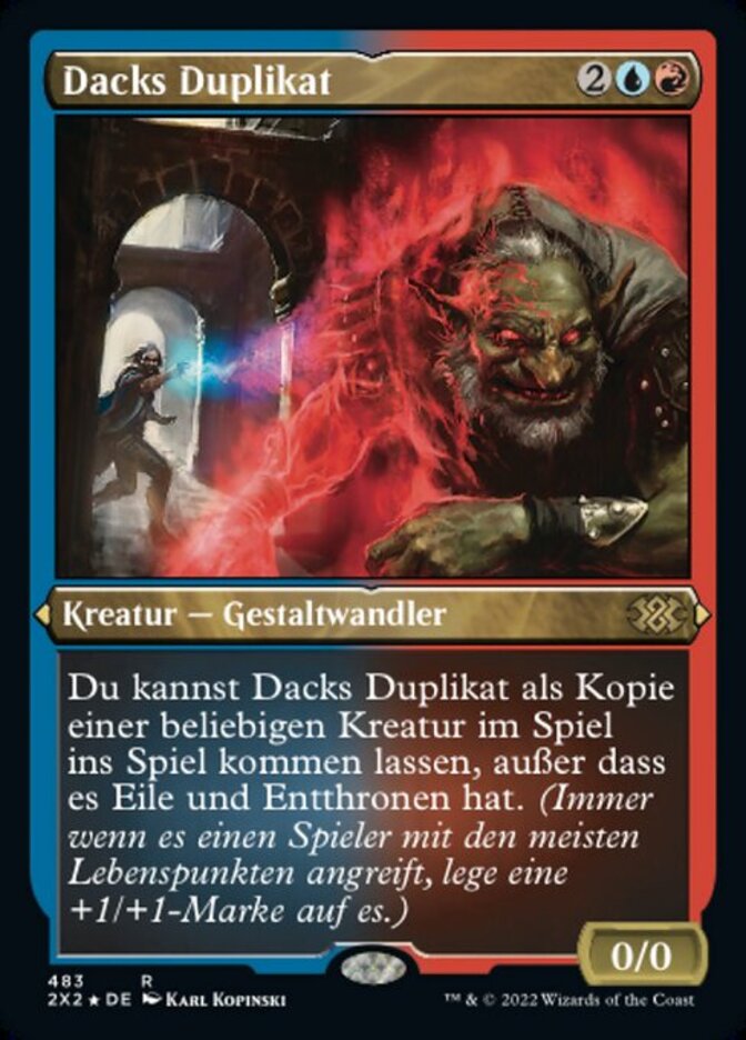 | Rules | You may have Dack's Duplicate enter the battlefield as a copy of any creature on the battlefield, except it has haste and dethrone. (Whenever it attacks the player with the most life or tied for most life, put a +1/+1 counter on it.) |