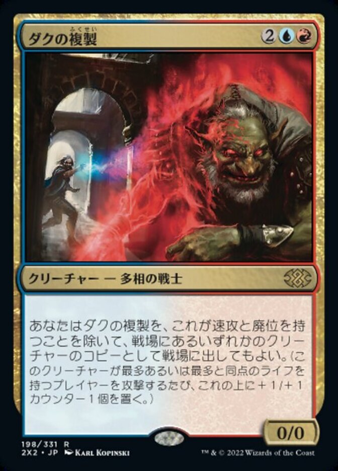 | Rules | You may have Dack's Duplicate enter the battlefield as a copy of any creature on the battlefield, except it has haste and dethrone. (Whenever it attacks the player with the most life or tied for most life, put a +1/+1 counter on it.) |