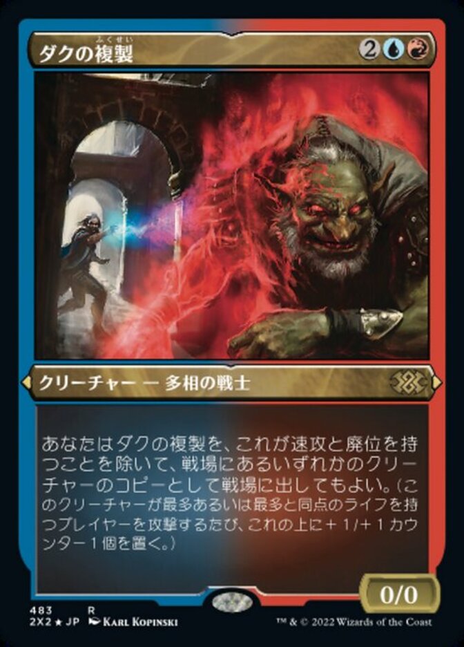 | Rules | You may have Dack's Duplicate enter the battlefield as a copy of any creature on the battlefield, except it has haste and dethrone. (Whenever it attacks the player with the most life or tied for most life, put a +1/+1 counter on it.) |