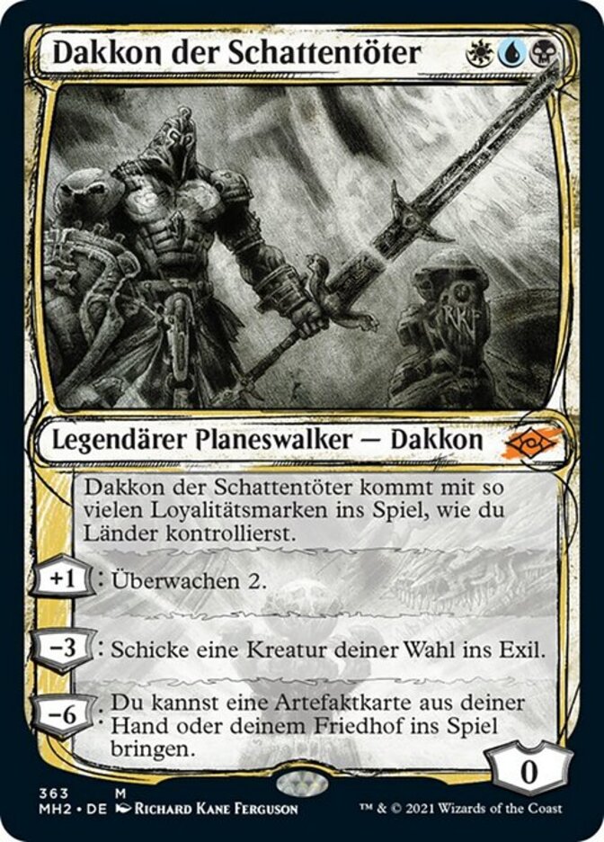 | Rules | Dakkon, Shadow Slayer enters the battlefield with a number of loyalty counters on him equal to the number of lands you control. +1: Surveil 2. −3: Exile target creature. −6: You may put an artifact card from your hand or graveyard onto the battlefield. |