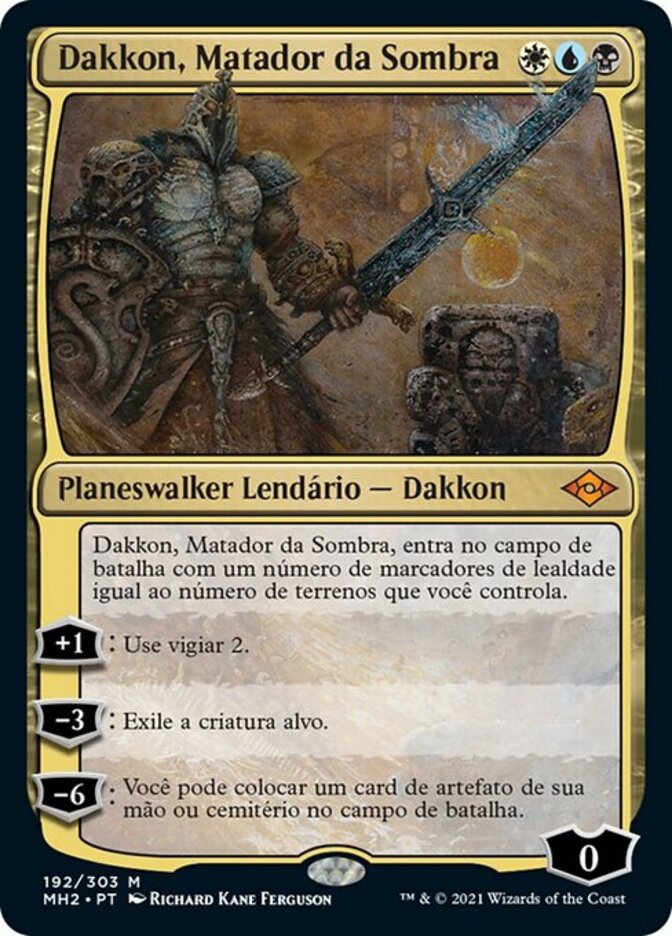 | Rules | Dakkon, Shadow Slayer enters the battlefield with a number of loyalty counters on him equal to the number of lands you control. +1: Surveil 2. −3: Exile target creature. −6: You may put an artifact card from your hand or graveyard onto the battlefield. |