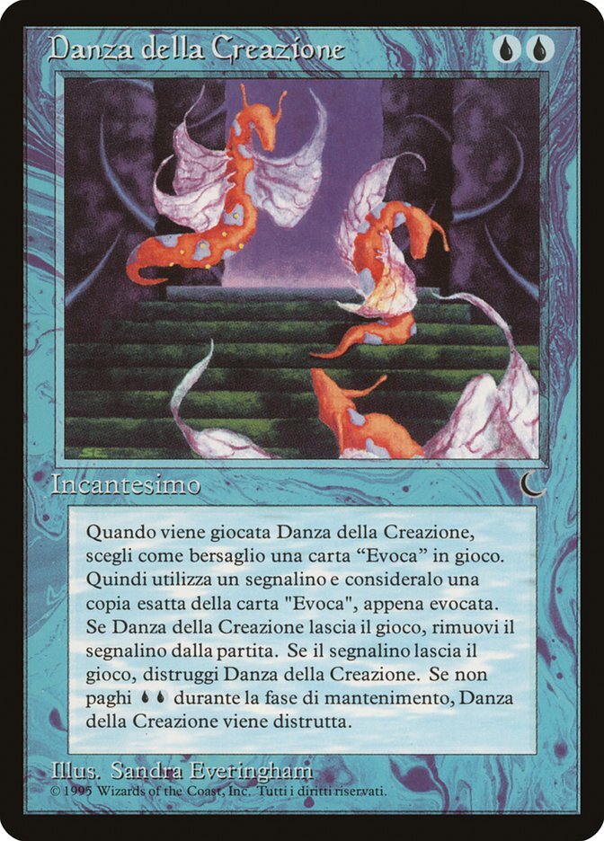 | Rules | When Dance of Many enters the battlefield, create a token that's a copy of target nontoken creature. When Dance of Many leaves the battlefield, exile the token. When the token leaves the battlefield, sacrifice Dance of Many. At the beginning of your upkeep, sacrifice Dance of Many unless you pay . |