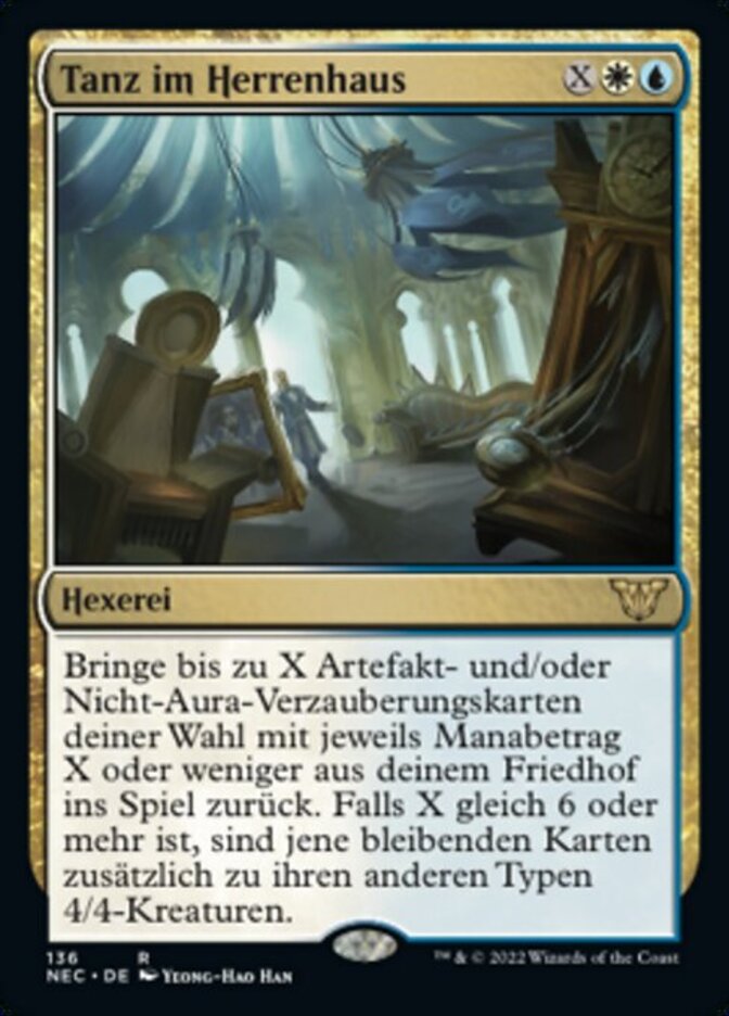 | Rules | Return up to X target artifact and/or non-Aura enchantment cards each with mana value X or less from your graveyard to the battlefield. If X is 6 or more, those permanents are 4/4 creatures in addition to their other types. |