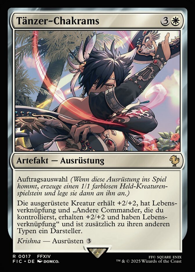 | Rules | Job select (When this Equipment enters, create a 1/1 colorless Hero creature token, then attach this to it.) Equipped creature gets +2/+2, has lifelink and "Other commanders you control get +2/+2 and have lifelink," and is a Performer in addition to its other types. Krishna — Equip |
