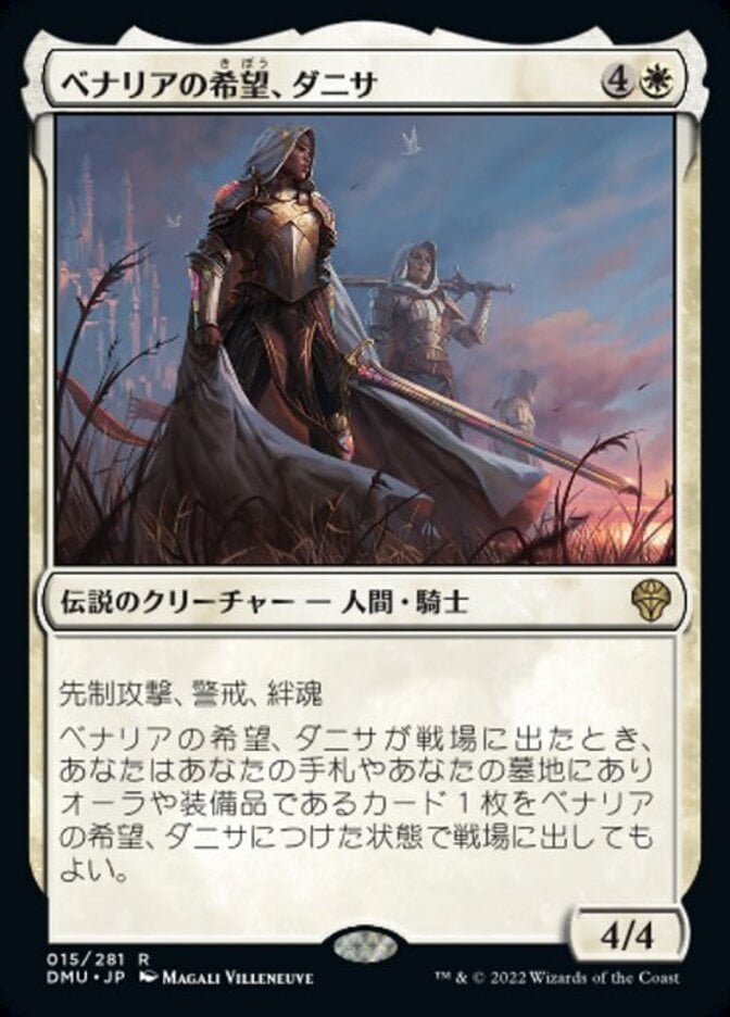 | Rules | First strike, vigilance, lifelink When Danitha, Benalia's Hope enters the battlefield, you may put an Aura or Equipment card from your hand or graveyard onto the battlefield attached to Danitha. |