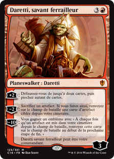 | Rules | +2: Discard up to two cards, then draw that many cards. −2: Sacrifice an artifact. If you do, return target artifact card from your graveyard to the battlefield. −10: You get an emblem with "Whenever an artifact is put into your graveyard from the battlefield, return that card to the battlefield at the beginning of the next end step." Daretti, Scrap Savant can be your commander. |