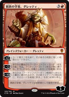 | Rules | +2: Discard up to two cards, then draw that many cards. −2: Sacrifice an artifact. If you do, return target artifact card from your graveyard to the battlefield. −10: You get an emblem with "Whenever an artifact is put into your graveyard from the battlefield, return that card to the battlefield at the beginning of the next end step." Daretti, Scrap Savant can be your commander. |
