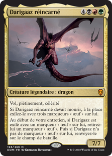 | Rules | Flying, trample, haste If Darigaaz Reincarnated would die, instead exile it with three egg counters on it. At the beginning of your upkeep, if Darigaaz is exiled with an egg counter on it, remove an egg counter from it. Then if Darigaaz has no egg counters on it, return it to the battlefield. |