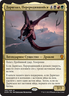 | Rules | Flying, trample, haste If Darigaaz Reincarnated would die, instead exile it with three egg counters on it. At the beginning of your upkeep, if Darigaaz is exiled with an egg counter on it, remove an egg counter from it. Then if Darigaaz has no egg counters on it, return it to the battlefield. |