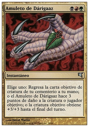 | Rules | Choose one — • Return target creature card from your graveyard to your hand. • Darigaaz's Charm deals 3 damage to any target. • Target creature gets +3/+3 until end of turn. |