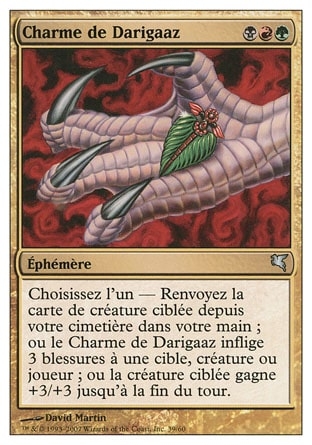 | Rules | Choose one — • Return target creature card from your graveyard to your hand. • Darigaaz's Charm deals 3 damage to any target. • Target creature gets +3/+3 until end of turn. |
