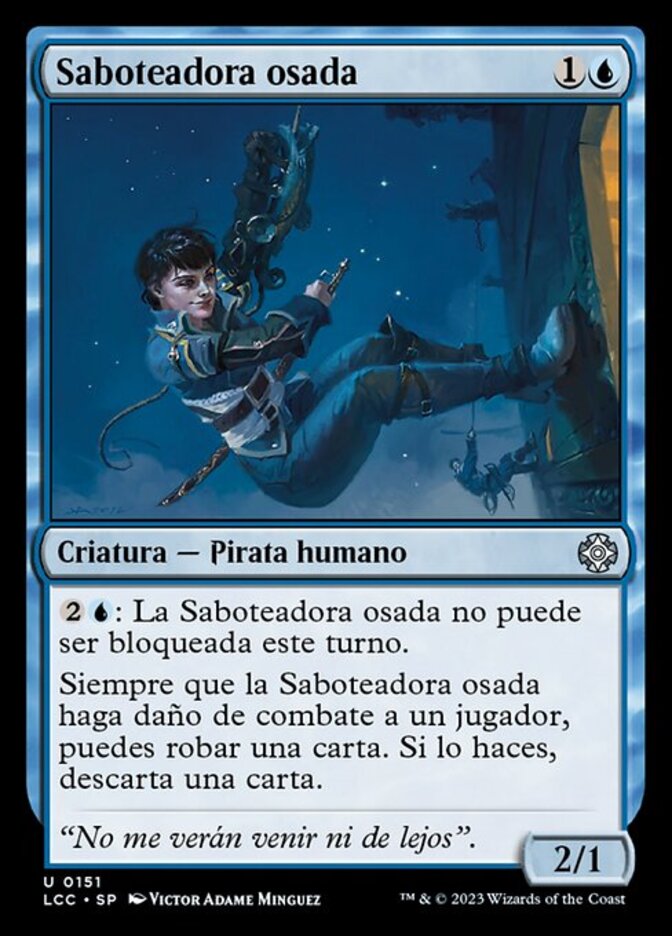 | Rules | : Daring Saboteur can't be blocked this turn. Whenever Daring Saboteur deals combat damage to a player, you may draw a card. If you do, discard a card. |