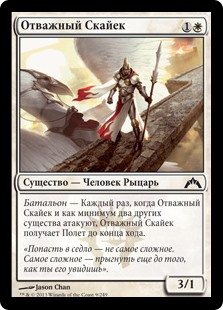 | Rules | Battalion — Whenever Daring Skyjek and at least two other creatures attack, Daring Skyjek gains flying until end of turn. |