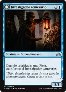 | Rules | When you sacrifice a Clue, transform Daring Sleuth. // Prowess (Whenever you cast a noncreature spell, this creature gets +1/+1 until end of turn.) Whenever Bearer of Overwhelming Truths deals combat damage to a player, investigate. (Create a colorless Clue artifact token with ", Sacrifice this artifact: Draw a card.") |