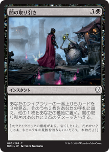 | Rules | Look at the top three cards of your library. Put two of them into your hand and the other into your graveyard. Dark Bargain deals 2 damage to you. |