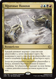 | Rules | Each opponent sacrifices a creature or planeswalker, then discards a card. You return a creature or planeswalker card from your graveyard to your hand, then draw a card. When you cast a Bolas planeswalker spell, exile Dark Intimations from your graveyard. That planeswalker enters the battlefield with an additional loyalty counter on it. |