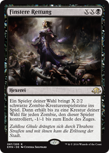 | Rules | Target player creates X 2/2 black Zombie creature tokens, then up to one target creature gets -1/-1 until end of turn for each Zombie that player controls. |