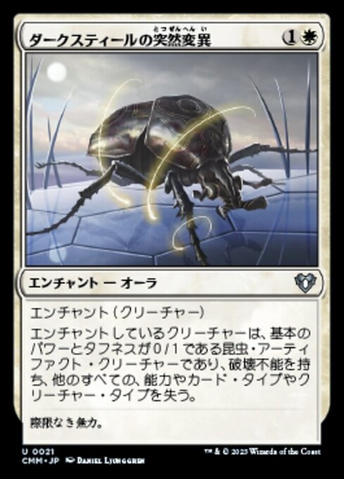 | Rules | Enchant creature Enchanted creature is an Insect artifact creature with base power and toughness 0/1 and has indestructible, and it loses all other abilities, card types, and creature types. |