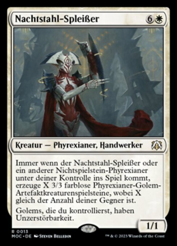 | Rules | Whenever Darksteel Splicer or another nontoken Phyrexian enters the battlefield under your control, create X 3/3 colorless Phyrexian Golem artifact creature tokens, where X is the number of opponents you have. Golems you control have indestructible. |