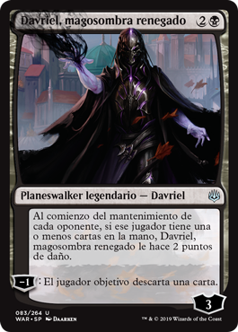 | Rules | At the beginning of each opponent's upkeep, if that player has one or fewer cards in hand, Davriel, Rogue Shadowmage deals 2 damage to them. −1: Target player discards a card. |