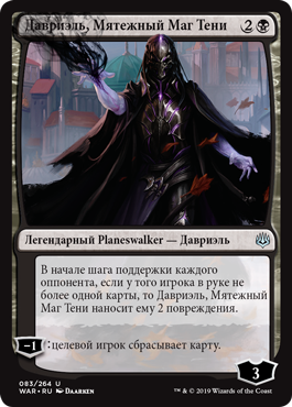 | Rules | At the beginning of each opponent's upkeep, if that player has one or fewer cards in hand, Davriel, Rogue Shadowmage deals 2 damage to them. −1: Target player discards a card. |