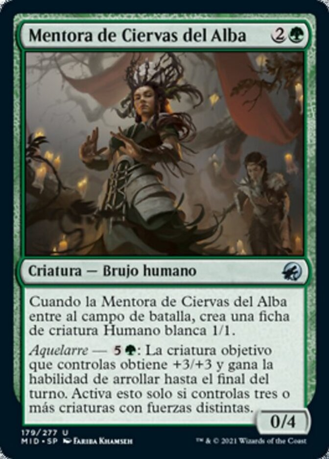| Rules | When Dawnhart Mentor enters the battlefield, create a 1/1 white Human creature token. Coven — : Target creature you control gets +3/+3 and gains trample until end of turn. Activate only if you control three or more creatures with different powers. |