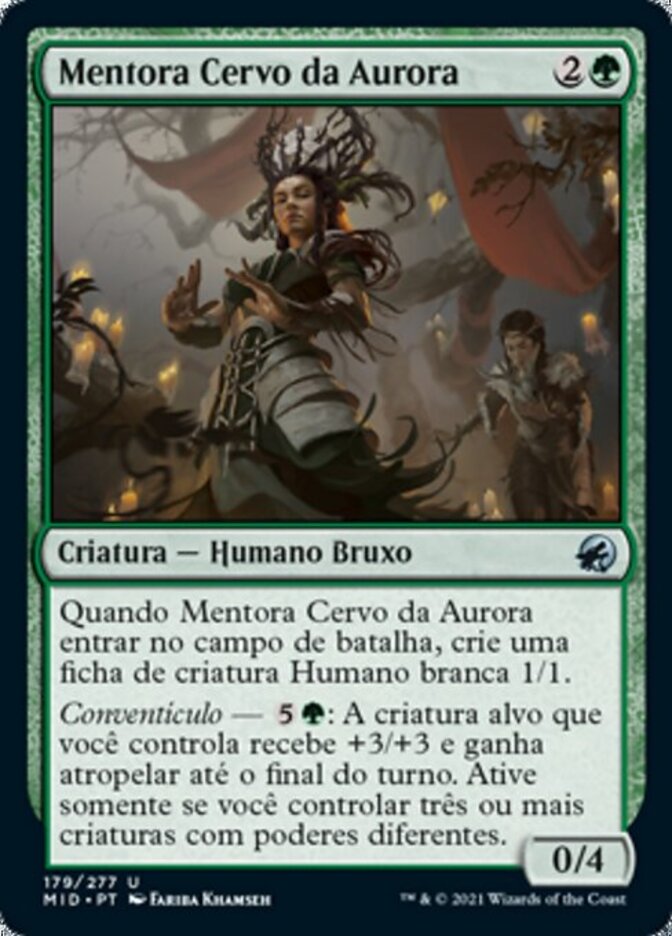 | Rules | When Dawnhart Mentor enters the battlefield, create a 1/1 white Human creature token. Coven — : Target creature you control gets +3/+3 and gains trample until end of turn. Activate only if you control three or more creatures with different powers. |