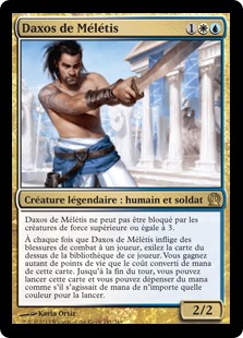 | Rules | Daxos of Meletis can't be blocked by creatures with power 3 or greater. Whenever Daxos of Meletis deals combat damage to a player, exile the top card of that player's library. You gain life equal to that card's mana value. Until end of turn, you may cast that card and you may spend mana as though it were mana of any color to cast that spell. |