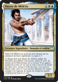 | Rules | Daxos of Meletis can't be blocked by creatures with power 3 or greater. Whenever Daxos of Meletis deals combat damage to a player, exile the top card of that player's library. You gain life equal to that card's mana value. Until end of turn, you may cast that card and you may spend mana as though it were mana of any color to cast that spell. |