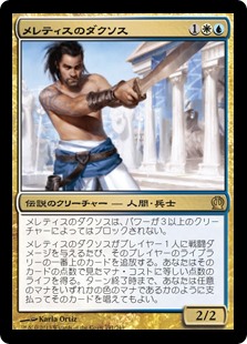 | Rules | Daxos of Meletis can't be blocked by creatures with power 3 or greater. Whenever Daxos of Meletis deals combat damage to a player, exile the top card of that player's library. You gain life equal to that card's mana value. Until end of turn, you may cast that card and you may spend mana as though it were mana of any color to cast that spell. |