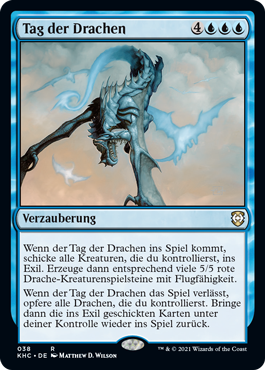 | Rules | When Day of the Dragons enters the battlefield, exile all creatures you control. Then create that many 5/5 red Dragon creature tokens with flying. When Day of the Dragons leaves the battlefield, sacrifice all Dragons you control. Then return the exiled cards to the battlefield under your control. |