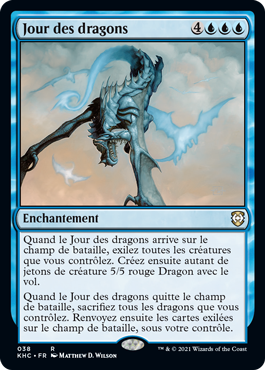| Rules | When Day of the Dragons enters the battlefield, exile all creatures you control. Then create that many 5/5 red Dragon creature tokens with flying. When Day of the Dragons leaves the battlefield, sacrifice all Dragons you control. Then return the exiled cards to the battlefield under your control. |